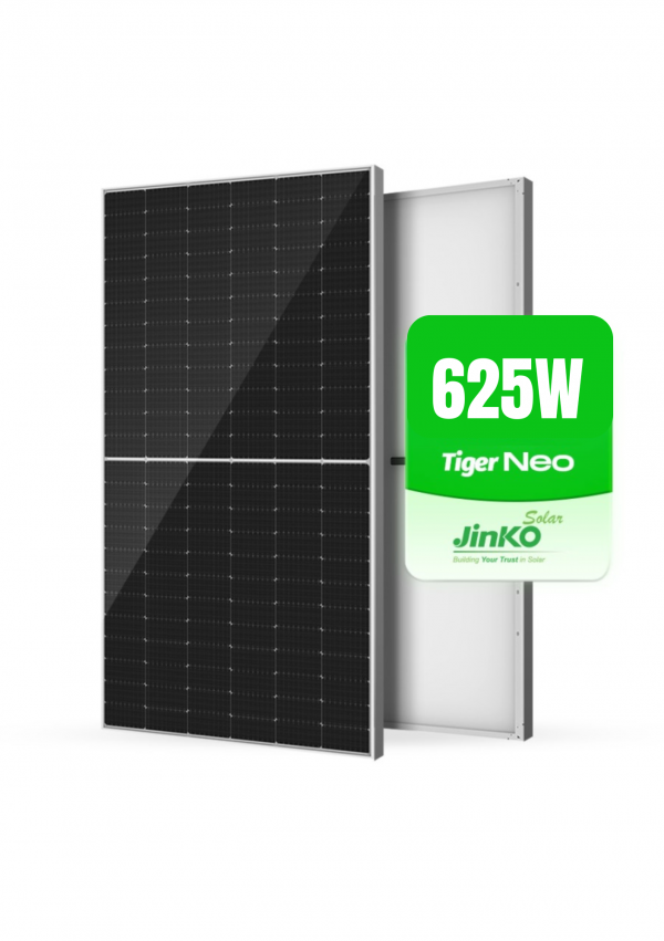 Solar Panels 615W (Bifacial) The Jinko 625W Tiger Neo Bifacial harnesses dual-side light capture with N-Type TOPCon cells and dual-glass glass-glass design. Delivering up to 22.72% front-side efficiency and an additional 15–25% from the rear, it’s engineered for maximum yield in large-scale arrays—complete with heavy-load certification and a 12-year product plus 30-year power warranty.